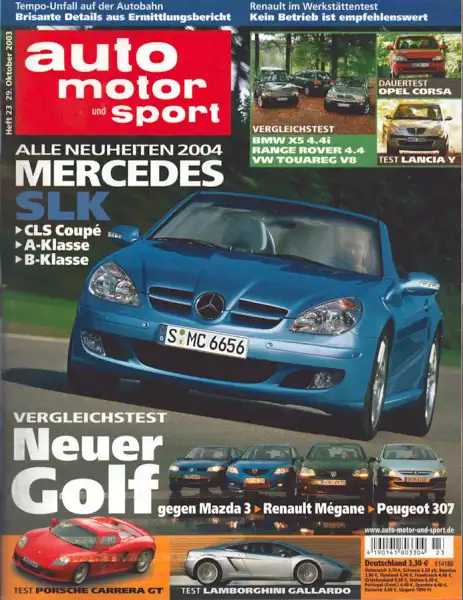 Porsche 911 Carrera GT BMW X 5 4.4i / Range Rover 4.4 / VW Touareg V 8 Opel Corsa 1.2 16 V Nissan 350 Z Roadster / Nissan Murano Mazda 3 Sport 1.6 / Peugeot 307 110 / Renault Mégane 1.6 16 V / VW Golf 1.6 FSI Lancia Ypsilon 1.3 JTD Lamborghini Gallardo Mit Gebrauchsspuren