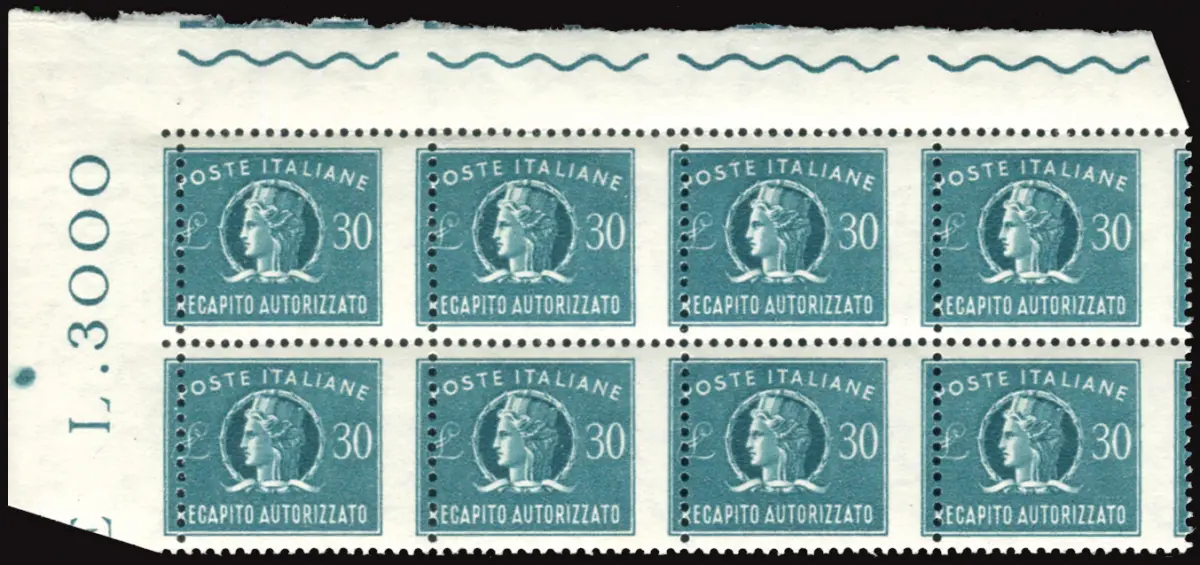 Autorisierte Lieferung Lire 30 Sorten Verzahnung verschieben Vollgummi MNH - Autorisierte Lieferung Lire 30 n. 13. Block von acht a. f. mit stark nach rechts verschobener vertikaler Verzahnung - Kat. euro 720 - Gebraucht Cod. 764/16