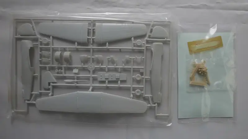 Einzelteile (Plastikbauteile) sind noch am Rahmen fixiert, Sichthülle wurde geöffnet.