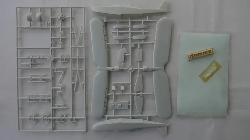 Einzelteile (Plastikbauteile) sind noch am Rahmen fixiert, Sichthülle wurde geöffnet.