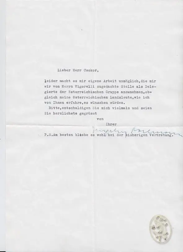 Bemerkungen: An Franz Theodor Csokor "...leider macht es mir eigene Arbeit unmöglich, die mir [...] zugedachte Stelle als Delegierte der österreichischen Gruppe anzunehmen..." Bachmann lehnte offenbar ein Angebot des damaligen Vizepräsident des Internationalen P.E.N.-Clubs F. T. Csokor ab.