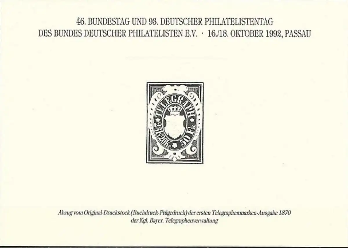 BAYERN 1992 Mi-Nr. 1. Telegraphenmarke Nachdruck Vignette