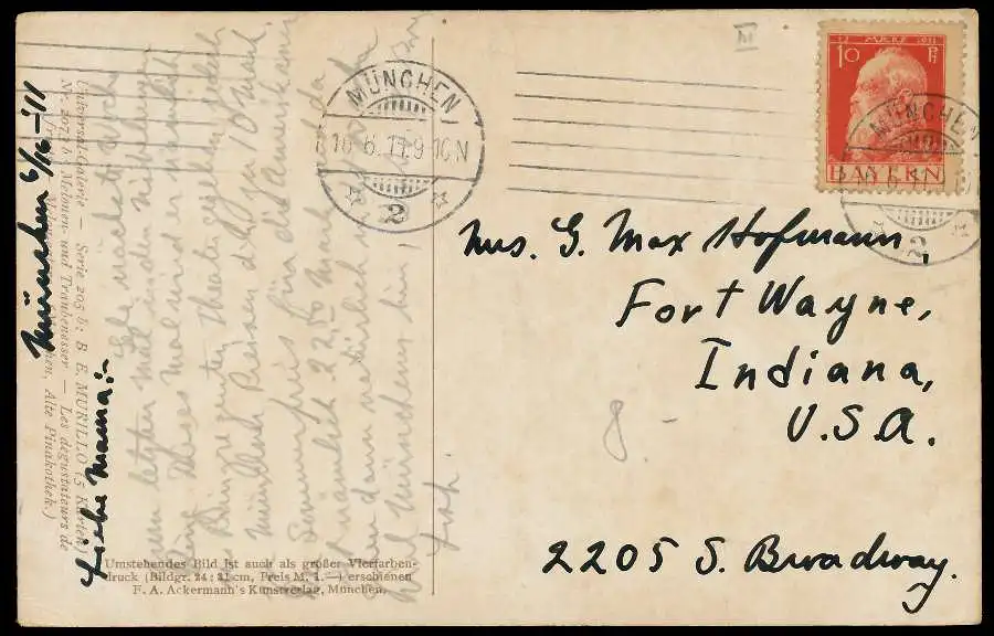 10 Pf Wert aus der Ausgabe zum 90. Geburtstag von Prinzregent Luitpold, Type I auf Postkarte in die USA