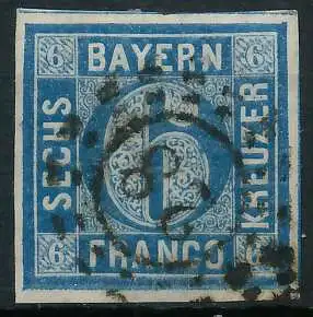 6 Kr blau, Freimarke, Wertziffer im Viereck (Quadratausgabe), offener Mühlradstempel Nr. 28, Augsburg Sc 0.- nach Sem, rückseitig sauber, ablösbarer Flazrest, gut gerandet, schönes Stück