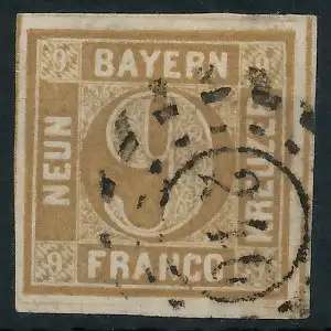 9 Kr braun, Freimarke, Wertziffer im Viereck (Quadratausgabe), offener Mühlradstempel Nr. 240, Kempten 9 Sc 3.- nach Sem, rückseitig sauber, ablösbarer Falzrest, gut gerandet