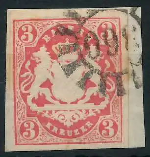 3 Kr rot, Freimarke, Staatswappen geschnitten, geschlossener Mühlradstempel Nr. 360, II=Obergünzburg Sc 8.- nach Sem
