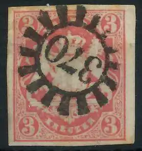 3 Kr rot, Freimarke, Staatswappen geschnitten, geschlossener Mühlradstempel Nr. 370, II=Ochsenfurt Uf 5.- nach Sem, knapp gerandet, rückseitig ablösbare Falzreste, darunter Seitenfaden ca. 3mm offen