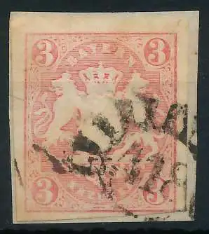 3 Kr rot, Freimarke, Staatswappen geschnitten, geschlossener Mühlradstempel Nr. 418, II=Regensburg Op 10.- nach Sem, Ecke unten rechts lupenrandig