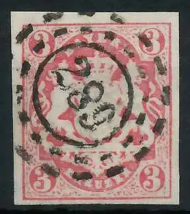 3 Kr rot, Freimarke, Staatswappen geschnitten, offener Mühlradstempel Nr. 289, Lindau 7 Sc 3.- nach Sem, rückseitig sauber, albösbarer Falzrest, gut gerandet