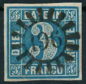 3 Kr blau, Freimarke, Wertziffer im Viereck (Quadratausgabe), geschlossener Mühlradstempel Nr. 196, I=Markbreit Uf 5.- / II=Hergatz Sc 90.- nach Sem, rückseitig Papierrest