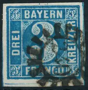 3 Kr blau, Freimarke, Wertziffer im Viereck (Quadratausgabe), geschlossener Mühlradstempel Nr. 240, I=Nittenau Op 20.- / II=Kempten Sc 8.- nach Sem, rückseitig sauber