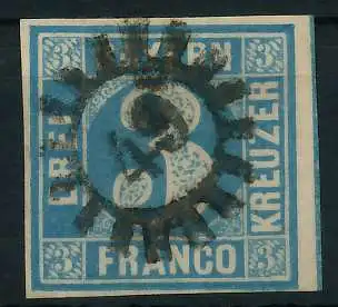 3 Kr blau, Freimarke, Wertziffer im Viereck (Quadratausgabe), allseits weissrandig, Stempel SEM 6.--, rückseitig sauber