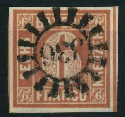 6 Kr braun, Freimarke, Wertziffer im Viereck (Quadratausgabe), allseits breitrandig, Stempel nach SEM 2.--, rückseitig sauber, sehr schönes Stück !