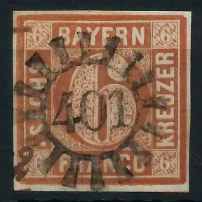 6 Kr braun, Freimarke, Wertziffer im Viereck (Quadratausgabe), geschlossener Mühlradstempel Nr. 401, I=Zweibrücken Pf 4.- / II=Pless Sc 50.- nach Sem, rückseitig sauber