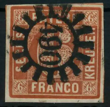6 Kr braun, Freimarke, Wertziffer im Viereck (Quadratausgabe), normalrandig, Stempel SEM 15,--, rückseitig sauber, kleine Falzspur