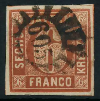6 Kr braun, Freimarke, Wertziffer im Viereck (Quadratausgabe), breitrandig, Stempel SEM 8,--, rückseitig sauber, Falzrest
