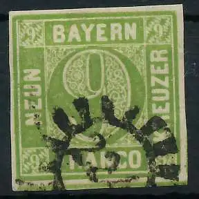9 Kr grün, Freimarke, Wertziffer im Viereck (Quadratausgabe), geschlossener Mühlradstempel Nr. 224, I=Nellenbruck Sc 125.- / II=Immenstadt Sc 4.- nach Sem, schmal- bis breitrandig, rückseitig sauber, Type III