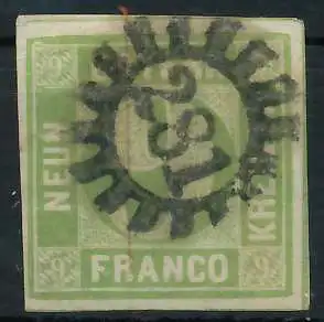 9 Kr grün, Freimarke, Wertziffer im Viereck (Quadratausgabe), geschlossener Mühlradstempel Nr. 281, I=Regensburg Op 0.- / II=Lechfeld Sc 600.- nach Sem, links unten schmal, sonst gut gerandet, Rückseitig sauber, ablösbare Falzspuren, Type III