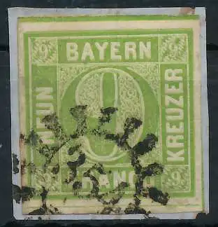 9 Kr grün, Freimarke, Wertziffer im Viereck (Quadratausgabe), geschlossener Mühlradstempel Nr. 354, I=Ühlfeld Mf 18.- / II=Nördlingen Sc 4.- nach Sem, allseits gut gerandet, Type III