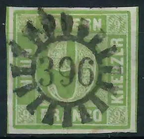 9 Kr grün, Freimarke, Wertziffer im Viereck (Quadratausgabe), geschlossener Mühlradstempel Nr. 396, I=Würzburg 2 Uf 2.- / II=Pilsting Nd 15.- nach Sem, gut gerandet, rückseitig sauber, ablösbarer Falzrest, Type III