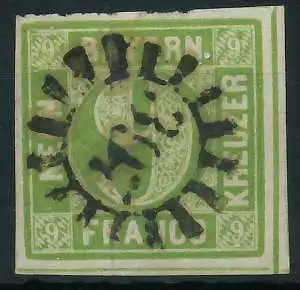 9 Kr grün, Freimarke, Wertziffer im Viereck (Quadratausgabe), geschlossener Mühlradstempel Nr. 397, I=Wüstensachsen Uf 75.- / II=Pirmasens Pf 20.- nach Sem, schmal- bis breitrandig,. oben Rand etwas ausgefranst, rückseitig sauber, ablösbarer Falzrest, Tape III