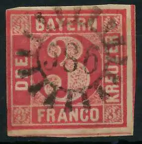 3 Kr rot, Freimarke, Wertziffer im Viereck (Quadratausgabe), geschlossener Mühlradstempel Nr. 586, II=Windsbach Mf 35.- nach Sem, da ist noch einiges an Gummierung vorhanden und etwas Papierreste, sollte sich ablösen lassen, links Randlinienschnitt