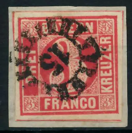 3 Kr rot, Freimarke, Wertziffer im Viereck (Quadratausgabe), normal- bis breitrandig, Stempel SEM 5.--