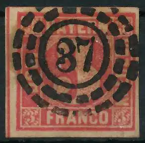 3 Kr rot, Freimarke, Wertziffer im Viereck (Quadratausgabe), offener Mühlradstempel Nr. 37, Bayreuth Of 0.- nach Sem, rückseitig sauber, ablösbarer Falzrest, git gerandet