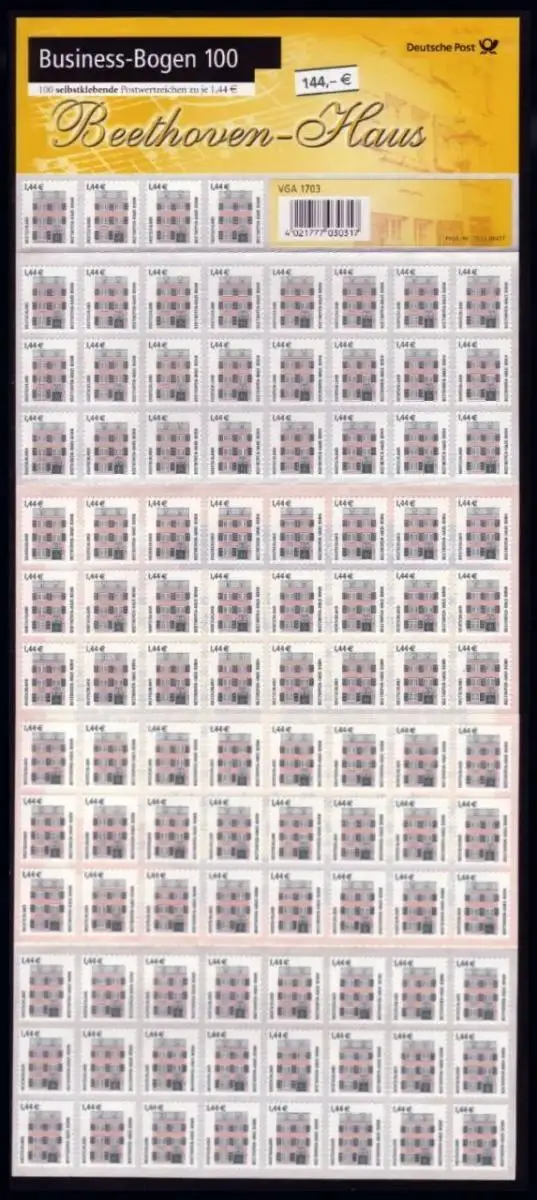 Folienblatt-Vorläufer - Sehenswürdigkeiten Beethoven-Haus Bonn, kompletter postfrischer Business-Bogen mit 100 selbstklebenden Marken, 1. Auflage mit rückseitig einer www-Bestelladresse