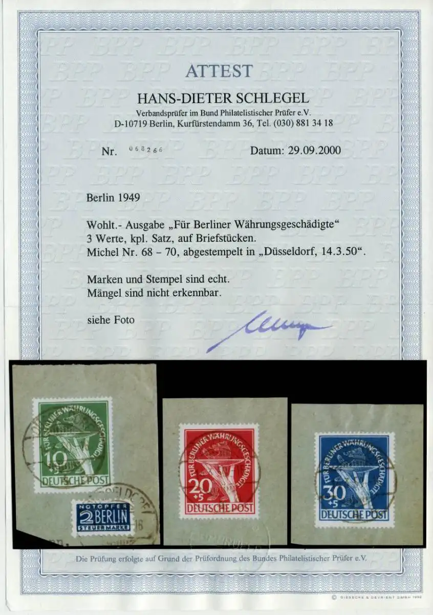 Währungsgeschädigte, mit zentrischem Stempel "DÜSSELDORF". BRD-Stempel auf den Anfangsausgaben von Berlin sind selten! Die Briefstücke vom Fotoattest wurden abgelöst, die Marken sind einwandfrei.