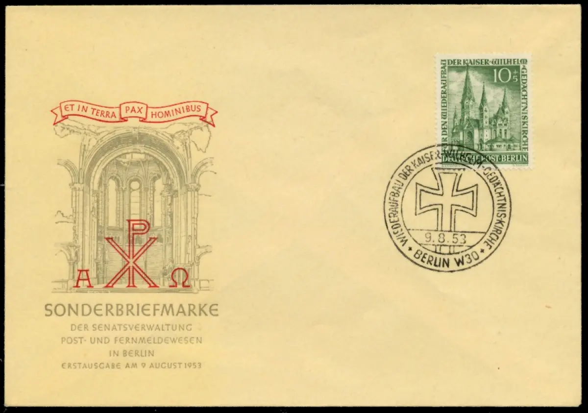 10 + 5 Pfg Gedächtniskirche auf FDC, rückseitig sauber
