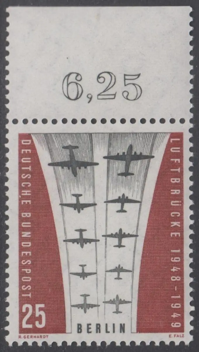 BERLIN 1959 Michel-Nummer 188 postfrisch EINZELMARKE RAND oben (d) - Berliner Luftbrücke