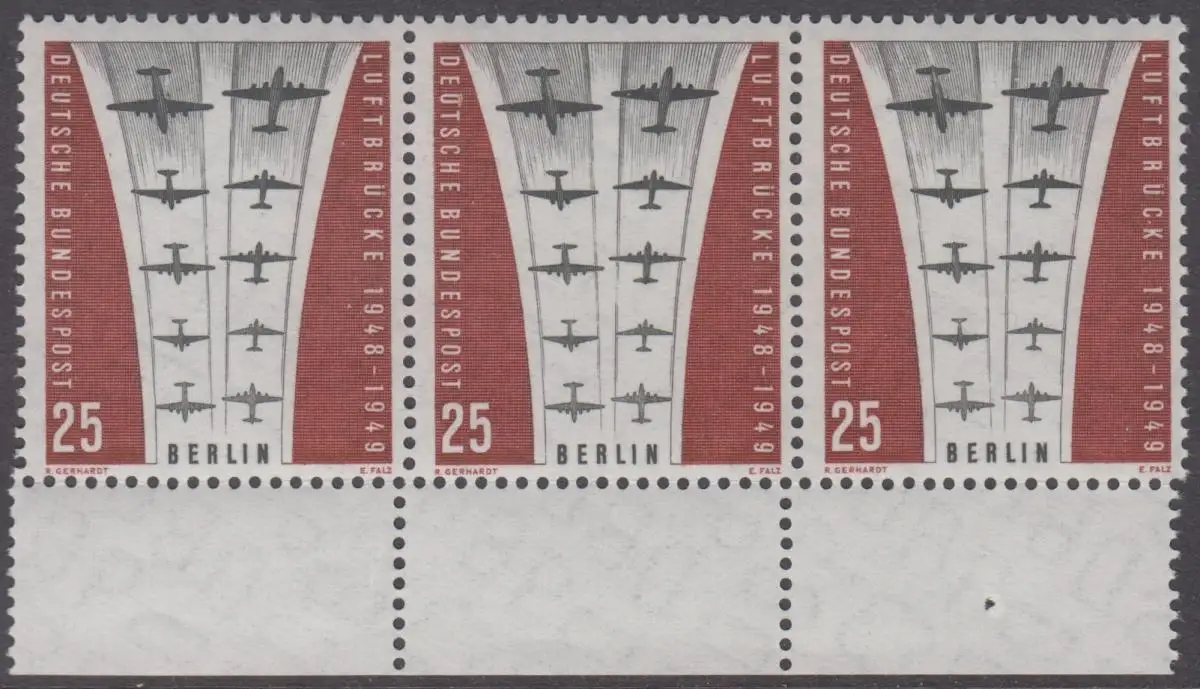 BERLIN 1959 Michel-Nummer 188 postfrisch horiz.STRIP(3) Randmarken unten m/ Perforations-Versatz - Berliner Luftbrücke
