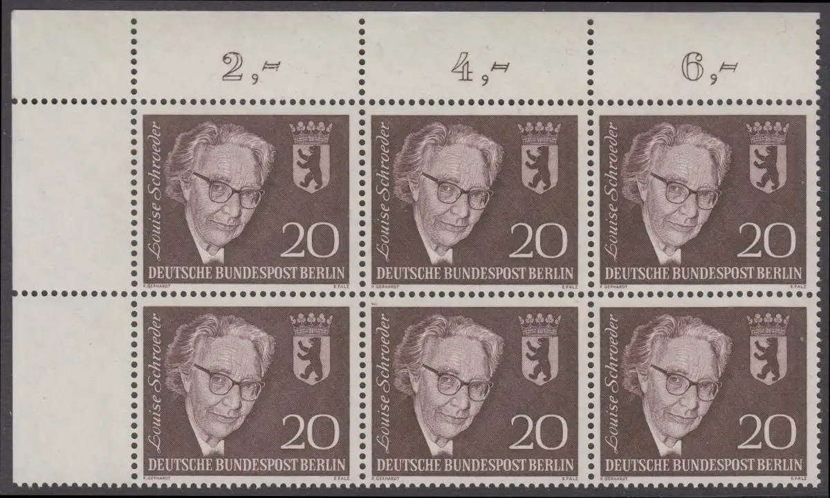 BERLIN 1961 Michel-Nummer 198 postfrisch horiz.BLOCK(6) ECKRAND oben links - Todestag von Louise Schröder, Politikerin
