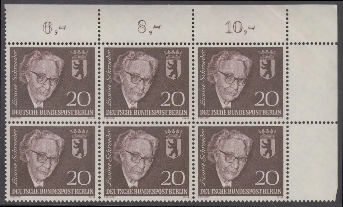 BERLIN 1961 Michel-Nummer 198 postfrisch horiz.BLOCK(6) ECKRAND oben rechts - Todestag von Louise Schröder, Politikerin