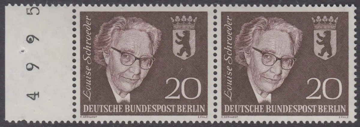 BERLIN 1961 Michel-Nummer 198 postfrisch horiz.PAAR RAND links /m/ Bogenzähler / b) - Todestag von Louise Schröder, Politikerin