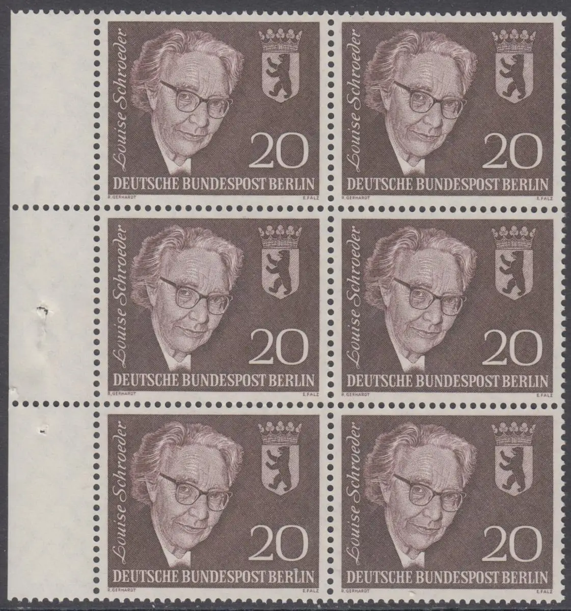 BERLIN 1961 Michel-Nummer 198 postfrisch vert.BLOCK(6) RÄNDER links - Todestag von Louise Schröder, Politikerin