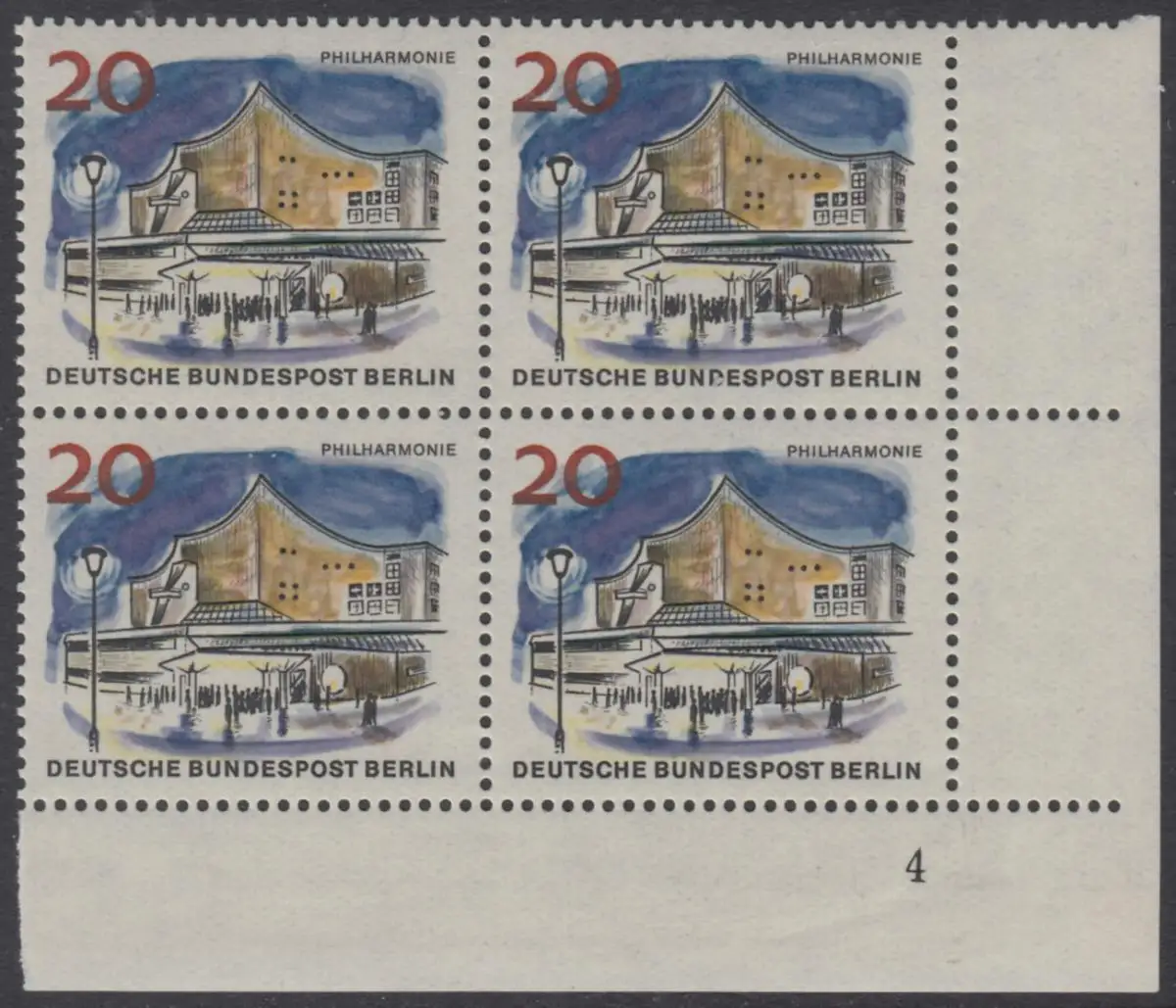 BERLIN 1965 Michel-Nummer 256 postfrisch BLOCK ECKRAND unten rechts m/ Formnummer - Das neue Berlin: Neue Philharmonie