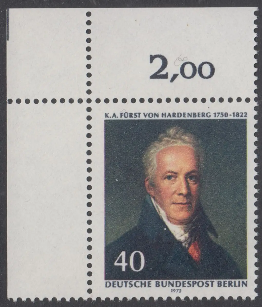 BERLIN 1972 Michel-Nummer 440 postfrisch EINZELMARKE ECKRAND oben links - Karl August Fürst von Hardenberg, preuß. Staatsmann