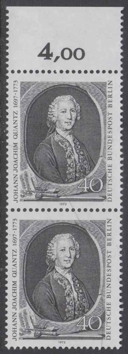 BERLIN 1973 Michel-Nummer 454 postfrisch vert.PAAR RAND oben (a) - Johann Joachim Quantz, Flötist und Komponist