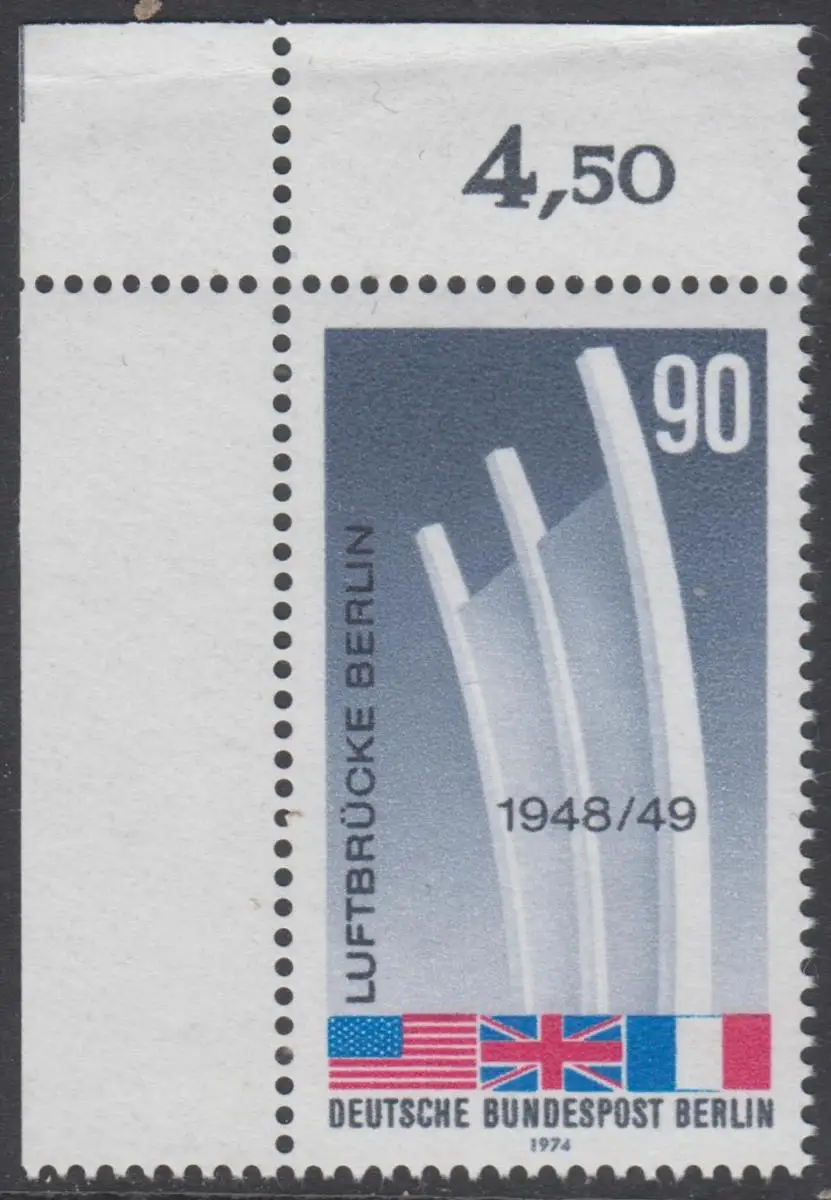 BERLIN 1974 Michel-Nummer 466 postfrisch EINZELMARKE ECKRAND oben links - Beendigung der Blockade Berlins; Berliner Luftbrücke