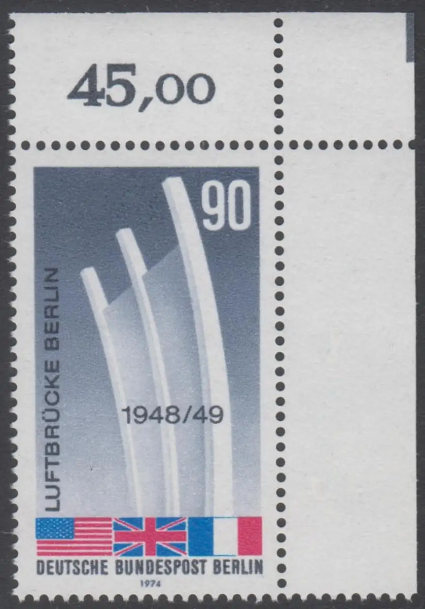 BERLIN 1974 Michel-Nummer 466 postfrisch EINZELMARKE ECKRAND oben rechts - Beendigung der Blockade Berlins; Berliner Luftbrücke