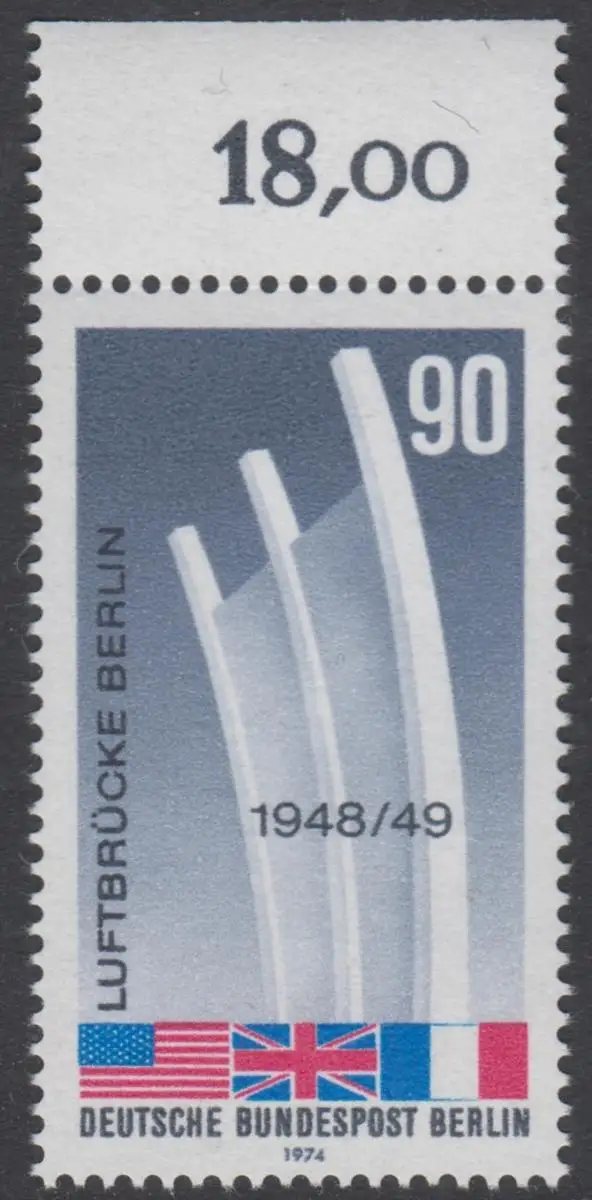 BERLIN 1974 Michel-Nummer 466 postfrisch EINZELMARKE RAND oben (c) - Beendigung der Blockade Berlins; Berliner Luftbrücke