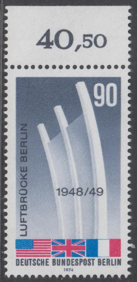 BERLIN 1974 Michel-Nummer 466 postfrisch EINZELMARKE RAND oben (k) - Beendigung der Blockade Berlins; Berliner Luftbrücke