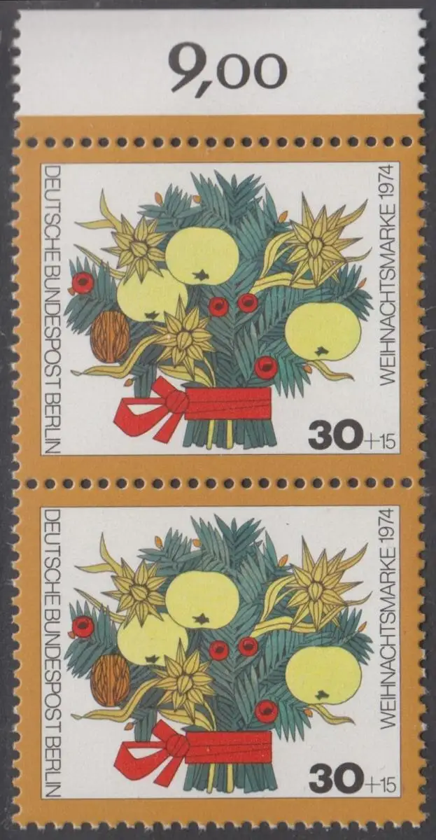 BERLIN 1974 Michel-Nummer 481 postfrisch vert.PAAR RAND oben (a) - Weihnachten