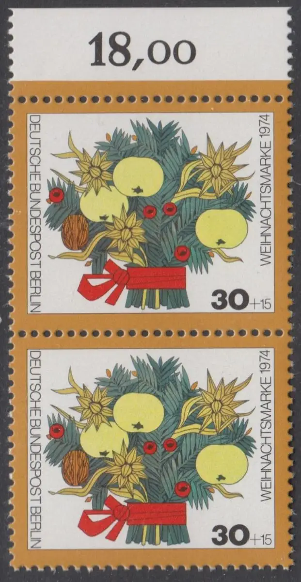 BERLIN 1974 Michel-Nummer 481 postfrisch vert.PAAR RAND oben (c) - Weihnachten