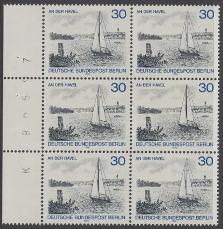 BERLIN 1976 Michel-Nummer 529 postfrisch vert.BLOCK(6) RÄNDER links - Berlin-Ansichten: An der Havel