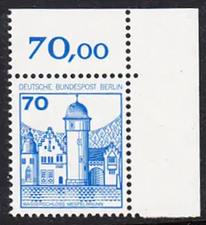 BERLIN 1977 Michel-Nummer 538 postfrisch EINZELMARKE ECKRAND oben rechts - Burgen und Schlösser: Wasserschloss Mespelbrunn