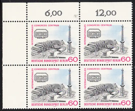 BERLIN 1979 Michel-Nummer 591 postfrisch BLOCK ECKRAND oben links - Internationales Congress-Centrum (ICC), Berlin
