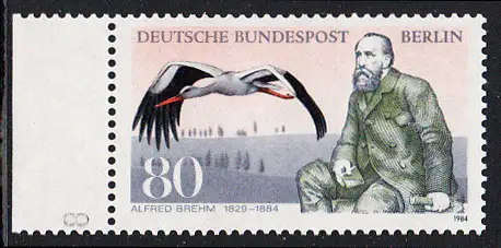 BERLIN 1984 Michel-Nummer 722 postfrisch EINZELMARKE RAND links (b) - Alfred Edmund Brehm, Zoologe